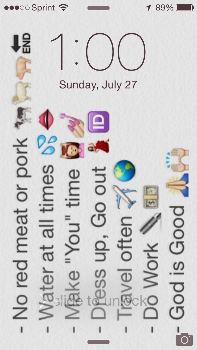 This is my screenshot. It’s my lock screen and it’s things that I want to keep in mind on a daily basis. It’s purpose is to keep me positive and focused. It’s said that if you are reminded of your goals daily, you are more likely to accomplish them. We’ll see what happens π.